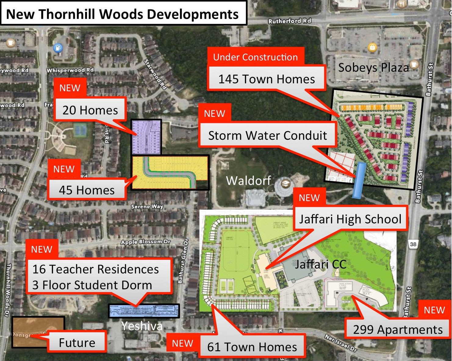 If you study the attached infographic you will note that there are FOUR NEW housing developments being proposed for Thornhill Woods including the revised Jaffari Community Centre master plan which includes a large number new townhouses, apartment units and a new private high school. We are very concerned that there is insufficient road, water, sewer and storm water capacity to support all of these projects and we can’t even begin to imagine the traffic chaos that is about to unfold around the north east corner of Thornhill Woods during major events at the Jaffari complex. We have all seen the parking and traffic chaos that has been steadily increasing in our area for years and many residents are extremely frustrated.